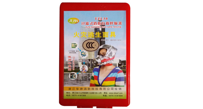 配備于賓館,飯店、辦公樓、商場、學校、幼兒園、醫(yī)院、影劇院、餐廳、公寓樓、住宅樓等場所,為突發(fā)火災時的逃生裝備。頭罩是由阻燃隔熱材料制成,眼窗為弧成結(jié)構(gòu)視野更廣闊,口鼻罩曲面與顏面部吻合嚴密,漏氣系數(shù)小。頭罩上使用了特殊的反光材料,增強了火場的識別能力。濾毒罐可有效地防護由于各種材料燃燒而產(chǎn)生的有毒害氣體和煙氣,特別對CO(一氧化碳)HCN(氰氫酸)及煙氯有很好的防護功能。